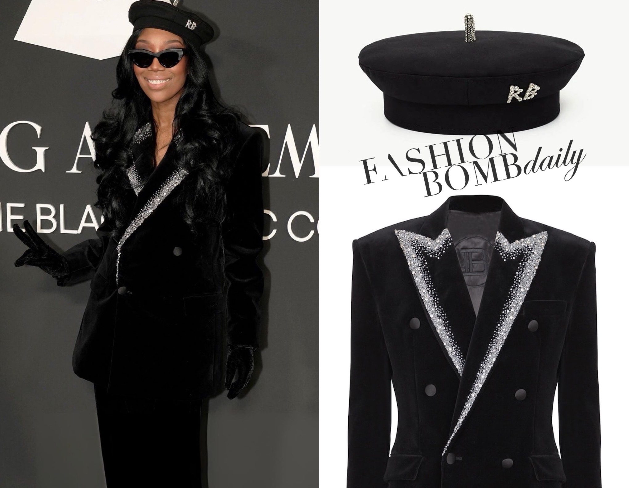 For the occasion, the singer wore a black velvet blazer by Balmain, detailed with crystal embellishments tracing the lapels and adding dimension to the structured tailoring.