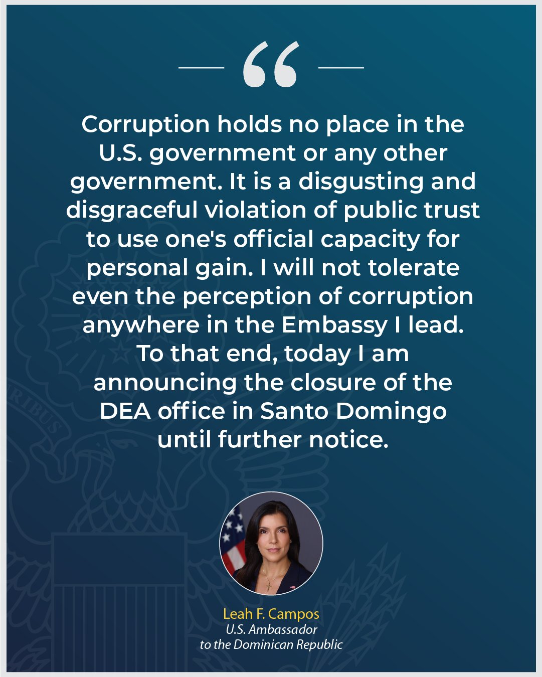 L’enquête est menée par Homeland Security Investigations (Newark et Saint-Domingue), le Service de sécurité diplomatique du Département d’État, le Bureau de l’Inspecteur général du Département de la Justice, ainsi que la DEA.