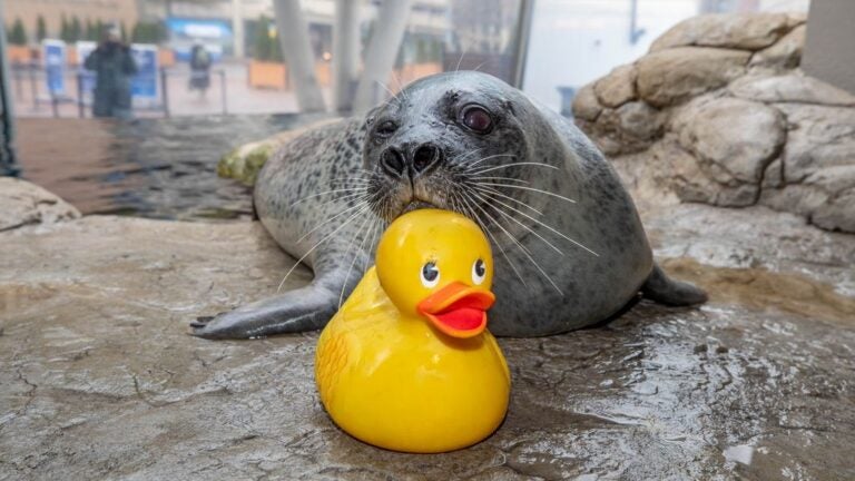 Reggae, a harbor seal at the New England Aquarium, poses with his rubber duck toy. Vanessa Kahn/New England Aquarium