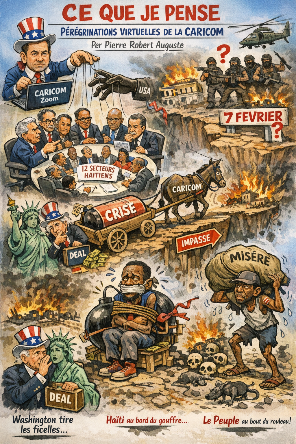 Pressée par le Secrétaire d’état américain Marco Rubio, enclin à l’usage de la force, indifférent aux données anthropologique, sociologique, historique indispensables à la bonne approche des crises structurelles comme celle d’Haiti, la Caricom a organisé le 30 janvier une autre pérégrination virtuelle avec les parties prenantes haitiennes regroupées en 12 secteurs, une référence duodecimale plus proche de l’ordre mystique ( comme dans la Bible, les 12 apôtres, les 12 tribus ) que des réalités sociologiques portées par plus de 200 partis et organisations politiques, un nombre infini de sociétés civiles, des sectes incalculables des affaires dont a été choisie la plus réactionnaire réputée incivique, antipatriote. Sur la table, Haïti était absent. Des ambitions personnelles s’entrecroisaient dans une atmosphère feutrée d’occultation prévisible. Deux semaines avant, une soixantaine de propositions signées des groupements haïtiens s’invitaient à l’attention des éminentes personnalités désignées pour la méditation par la Caricom. Les parties haïtiennes voulaient s’écouter parler en bandes éparses et n’ont pas choisi de négocier. Pour négocier, il aurait fallu aligner Washington comme partie prenante créditée d’une position publique discutable, pas inarrêtable, donc sujette au compromis. Il aurait fallu demander aux médiateurs la garantie de leur indépendance, de n’être pas la courroie de transmission de Washington. Il aurait fallu, avant toute chose, savoir faire front commun ou s’y préparer.
