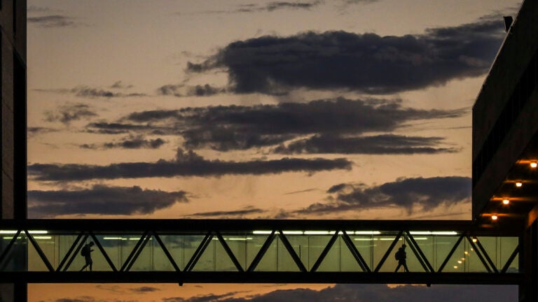 Students walk through UMass Boston’s campus on Thursday evening. Erin Clark/The Boston Globe
